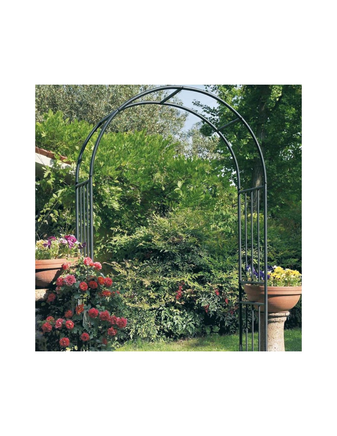 - Finitura resistente: La vernice a polvere verde conferisce all'arco un aspetto elegante e protegge il ferro dagli agenti atmosferici, garantendo una lunga durata nel tempo.