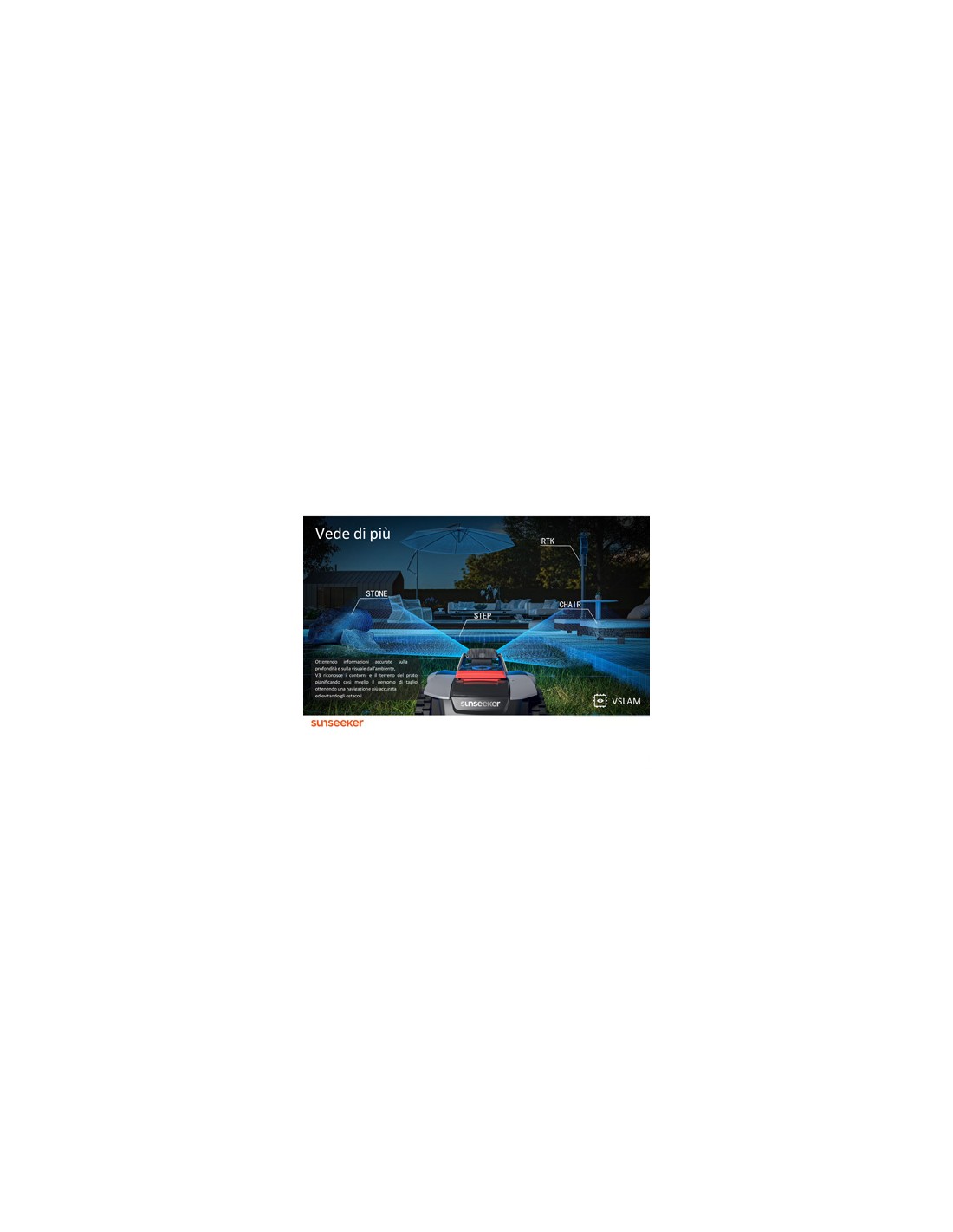 La "Binocular Camera" fornisce misurazioni accurate della distanza e una percezione dettagliata dell'ambiente, garantendo un taglio preciso anche intorno agli oggetti più complessi. Il V3 è in grado di riconoscere oltre 30 classi di oggetti, tra cui persone, fiori, animali, arredi da giardino, tubi per l'irrigazione, pozzetti, tombini, giochi, ombre, recinzioni e camminamenti. Anche i prati irregolari non rappresentano un problema per il Sunseeker V3.