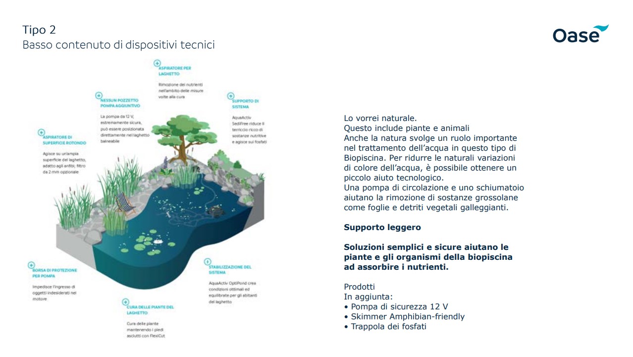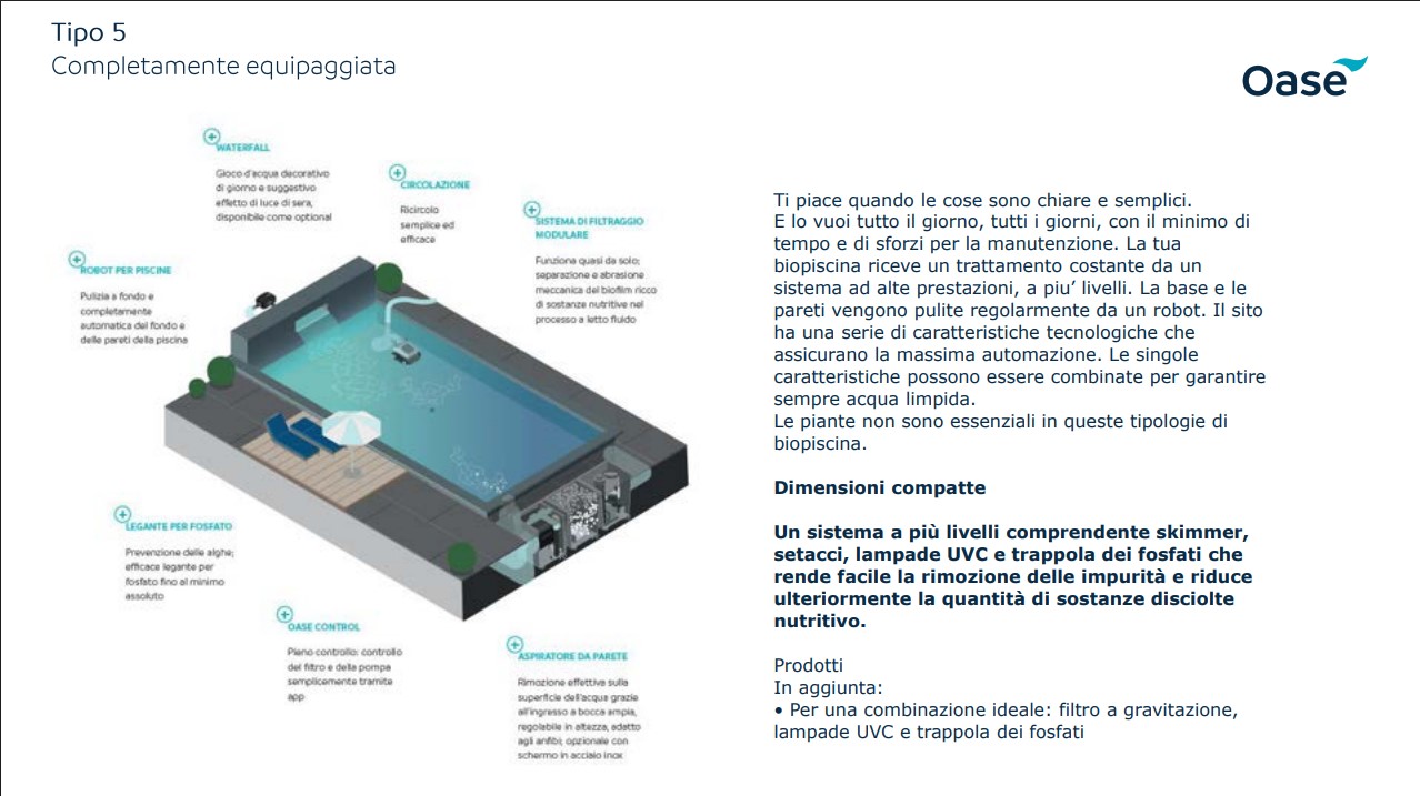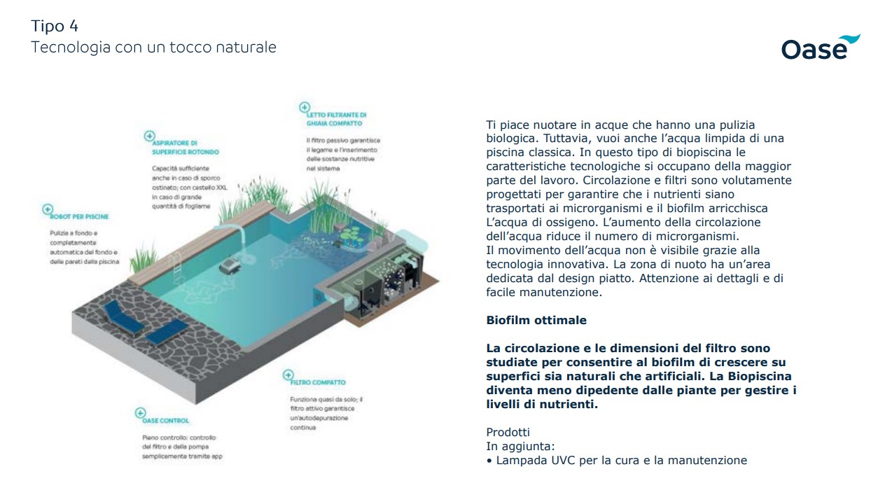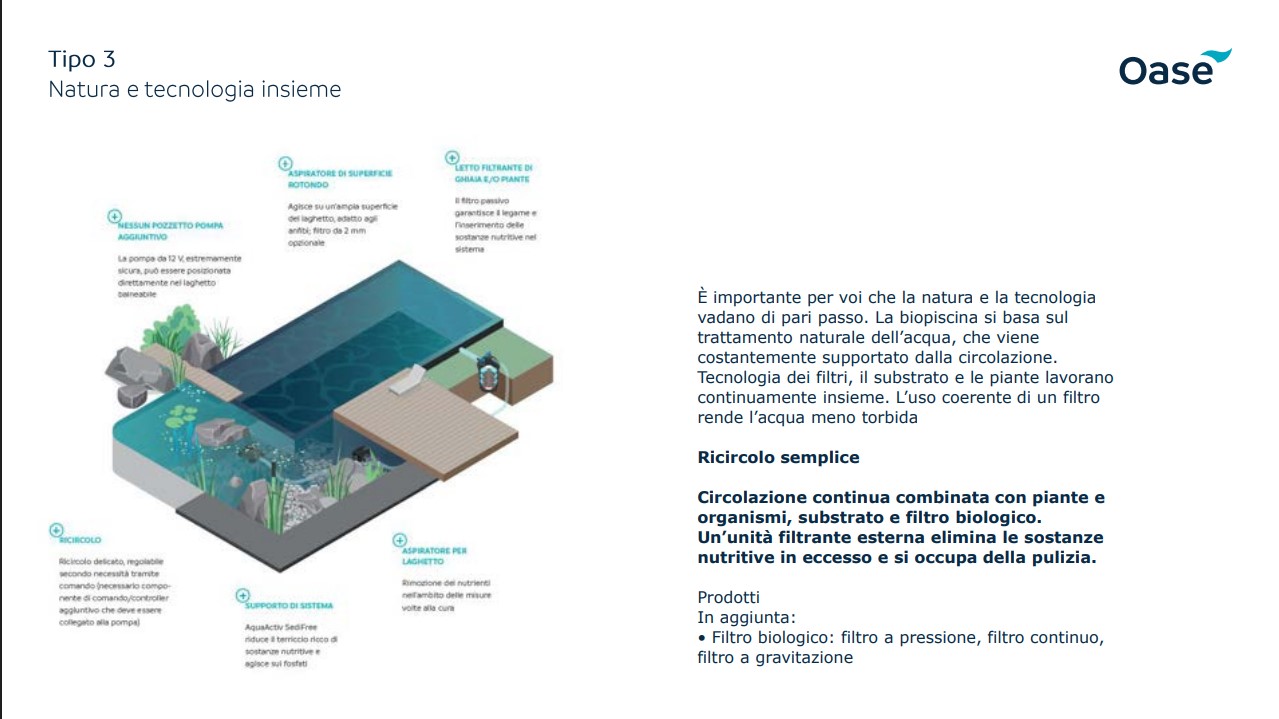 Questo significa combinare innovazione tecnologica, design naturale e facilità di gestione in un'unica soluzione. Il risultato è un'acqua sempre cristallina, senza l'aggiunta di prodotti chimici e senza la necessità di gestire una zona di fitodepurazione tradizionale.