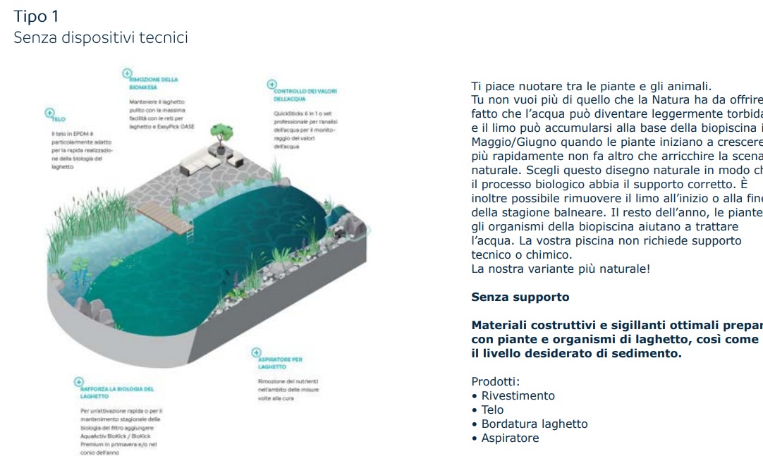 Quando si parla di biopiscine, non esiste una soluzione unica. La normativa FLL (Forschungsgesellschaft Landschaftsentwicklung Landschaftsbau), sviluppata in Austria e Germania, ha definito 5 categorie che rappresentano diversi livelli di integrazione tra natura e tecnologia.