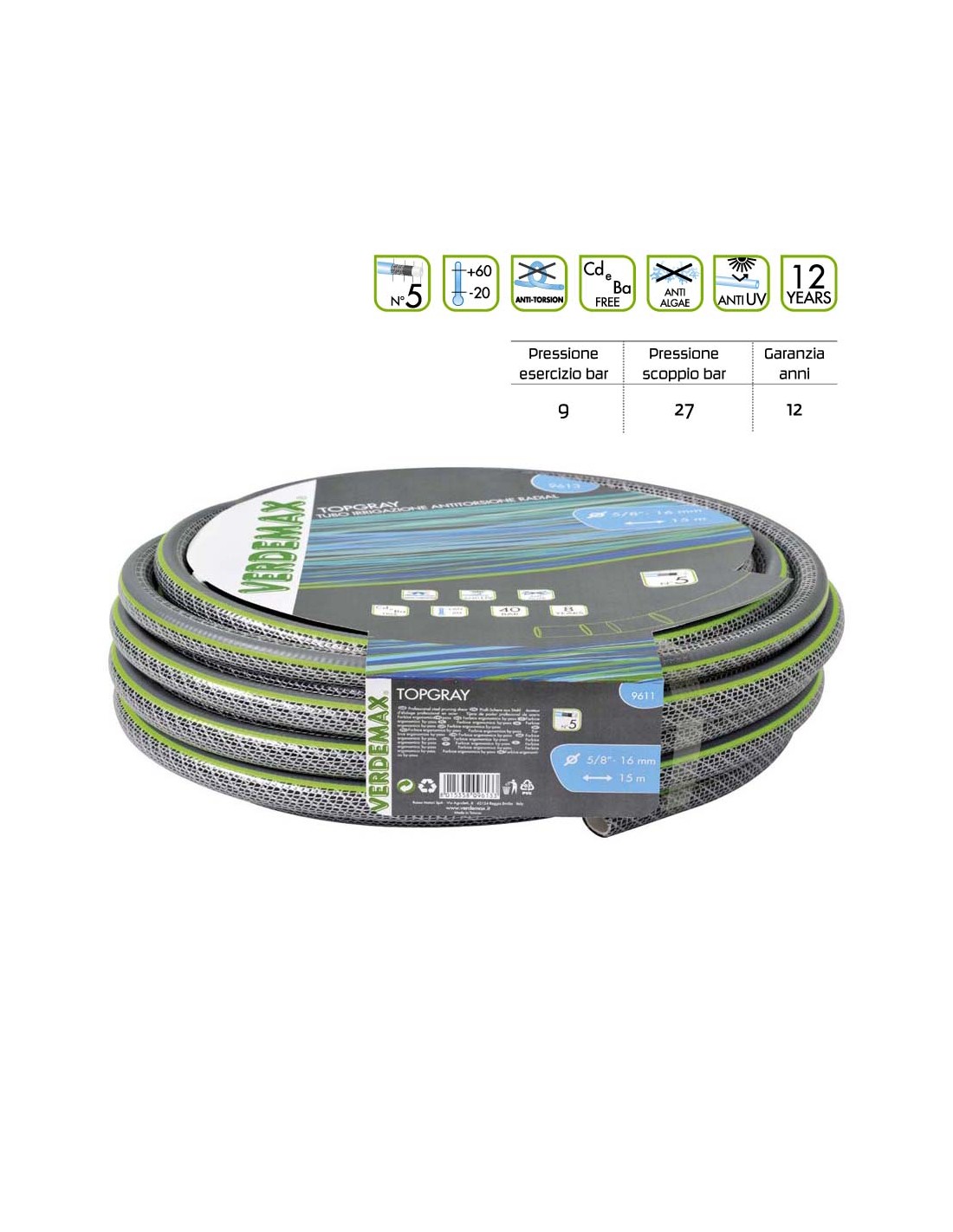 Il tubo da giardino antitorsione Verdemax Topgrey è un prodotto di alta qualità, progettato per soddisfare le esigenze di chi cerca un tubo resistente, pratico e funzionale. Grazie alla sua struttura a 5 strati e al design antitorsione, questo tubo ti aiuterà a mantenere il tuo giardino sempre verde e rigoglioso, senza fatica e senza sprechi d'acqua.