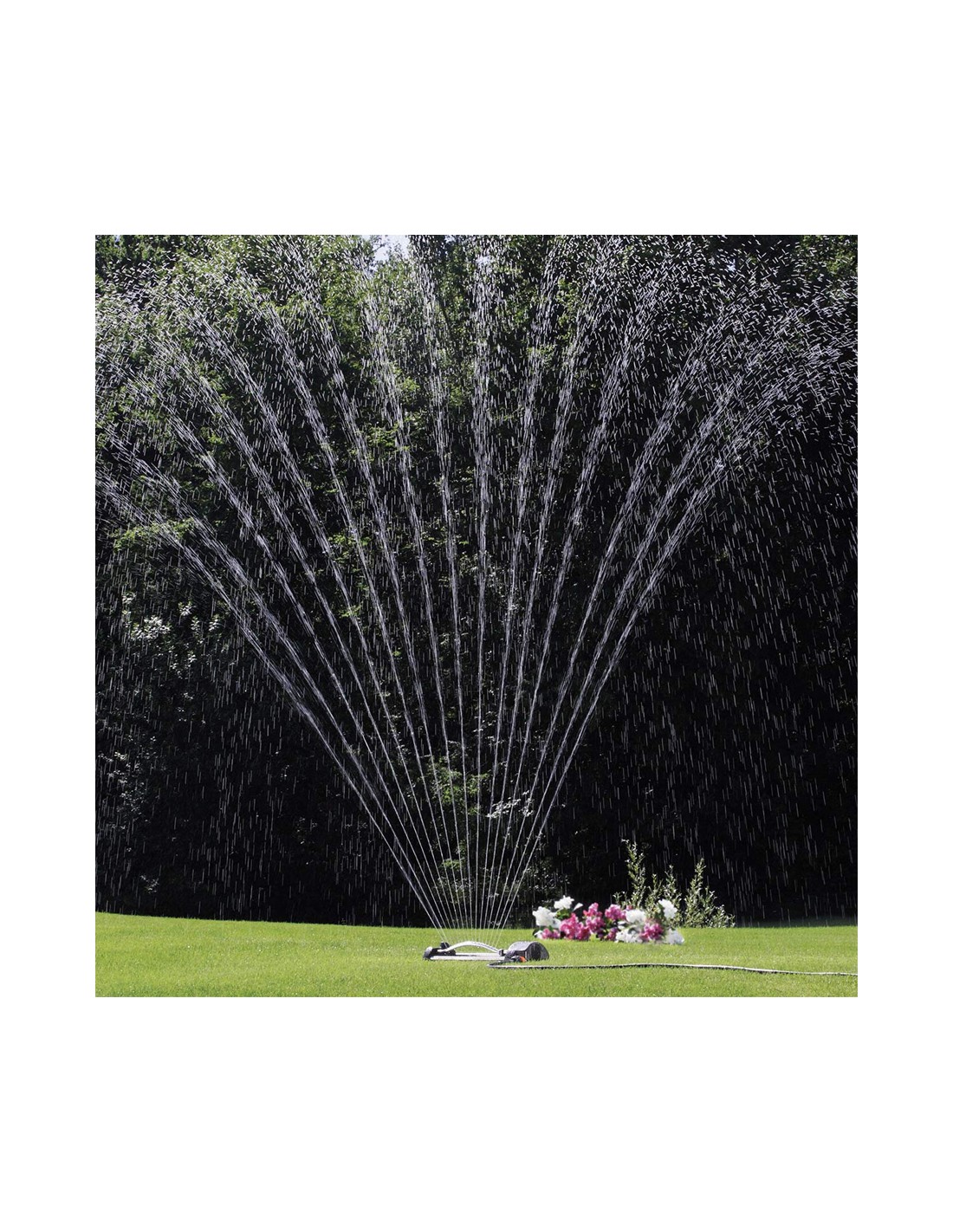 Braccio oscillante in alluminio con 16 ugelli riportati in ottone che garantiscono getti d’acqua regolari. Motore idraulico con ingranaggi autolubrificanti in resina acetalica anti-usura. Turbina di grande diametro molto efficiente anche a basse pressioni. La robusta cassa in ABS che contiene il motore idraulico è ispezionabile. Dispositivo di selezione delle aree bagnate con pratico posizionamento a innesto (5 diverse posizioni). Base a slitta con elementi in alluminio di grande sezione (Ø 15 mm), molto stabile sul terreno e facile da trainare. Area massima irrigata 290 m².