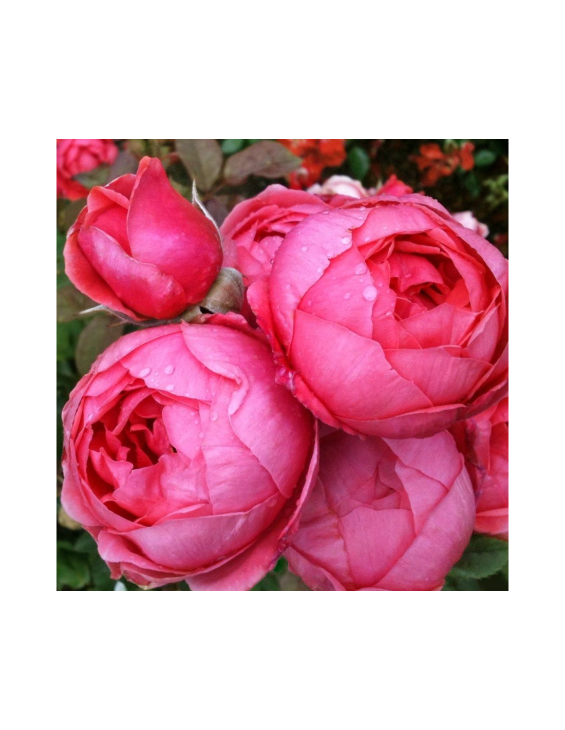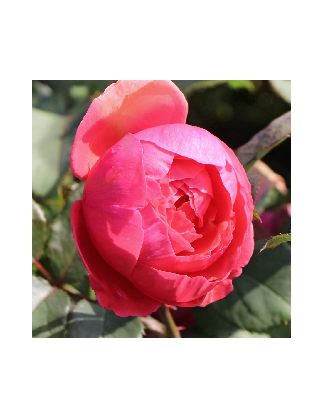 Fiore doppio globulare, dall'intensa colorazione rosa tendente al rosso, 6 cm di diametro con più di 20 petali estremamente profumati.