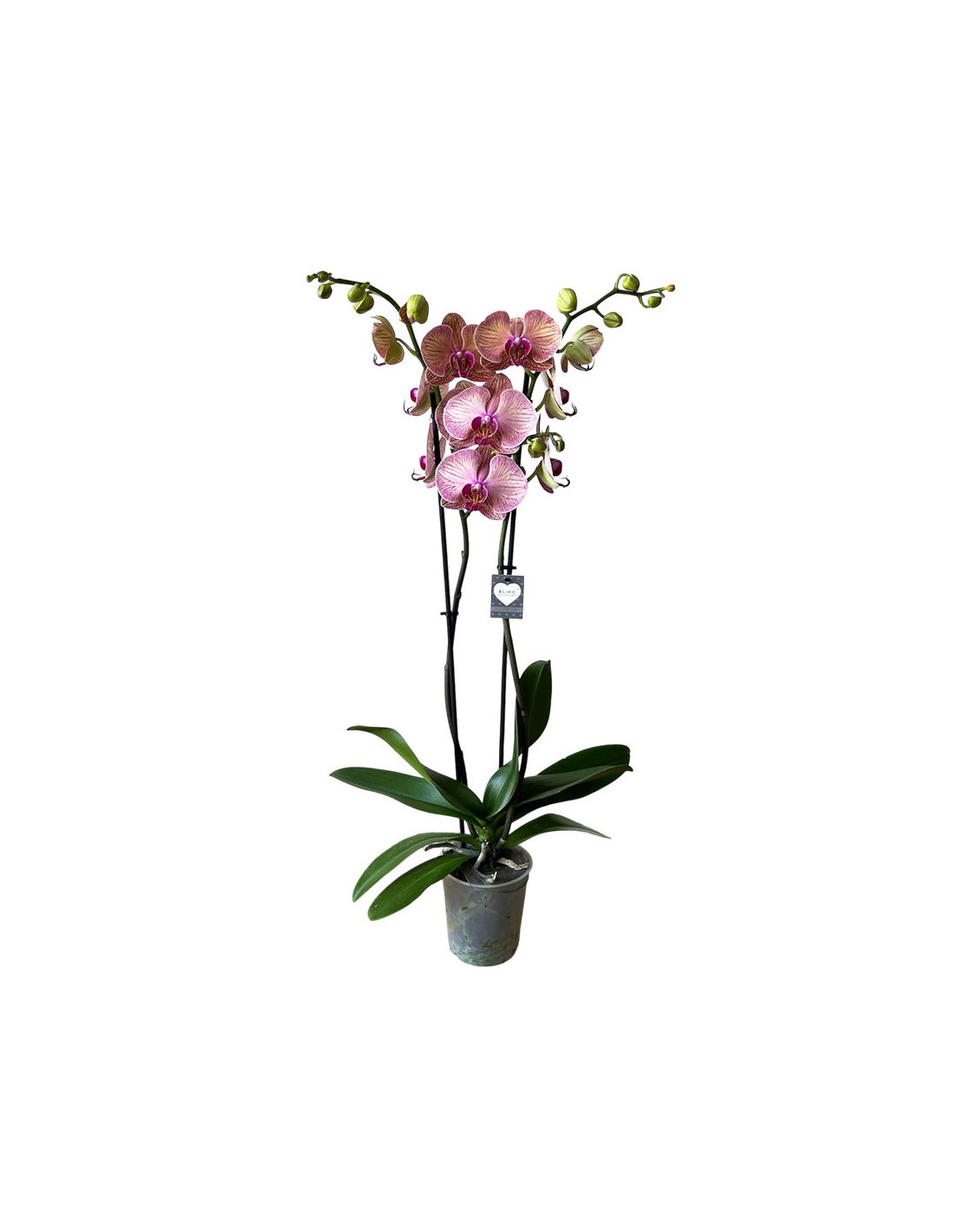 Lasciati incantare dalla maestosa bellezza dell'Orchidea Phalaenopsis 'Golden Leopard', una varietà eccezionale che si distingue per i suoi fiori unici e affascinanti. Con i suoi due steli imponenti e un vaso dal diametro di 12 cm, questa Orchidee è una vera gemma per qualsiasi ambiente, capace di trasformare un semplice angolo in un punto focale di grande impatto visivo. I suoi petali, impreziositi da un intrigante motivo maculato che ricorda la pelliccia di un leopardo, in tonalità calde che vanno dal rosa al dorato, la rendono una scelta sofisticata per arricchire la tua collezione di piante o per fare un regalo indimenticabile. La 'Golden Leopard' non è solo spettacolare, ma anche gratificante da coltivare, rendendola adatta sia agli esperti che ai principianti.