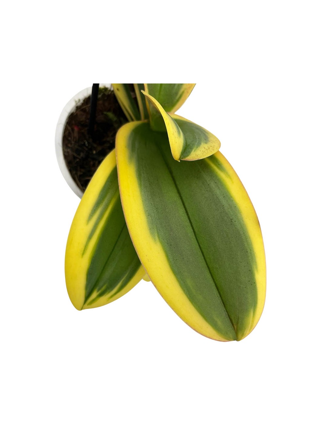 Fogliame Variegato: La sua peculiarità più affascinante sono le foglie bicolore, con striature gialle che si stagliano sul verde intenso, creando un effetto visivo sorprendente anche in assenza di fioritura.