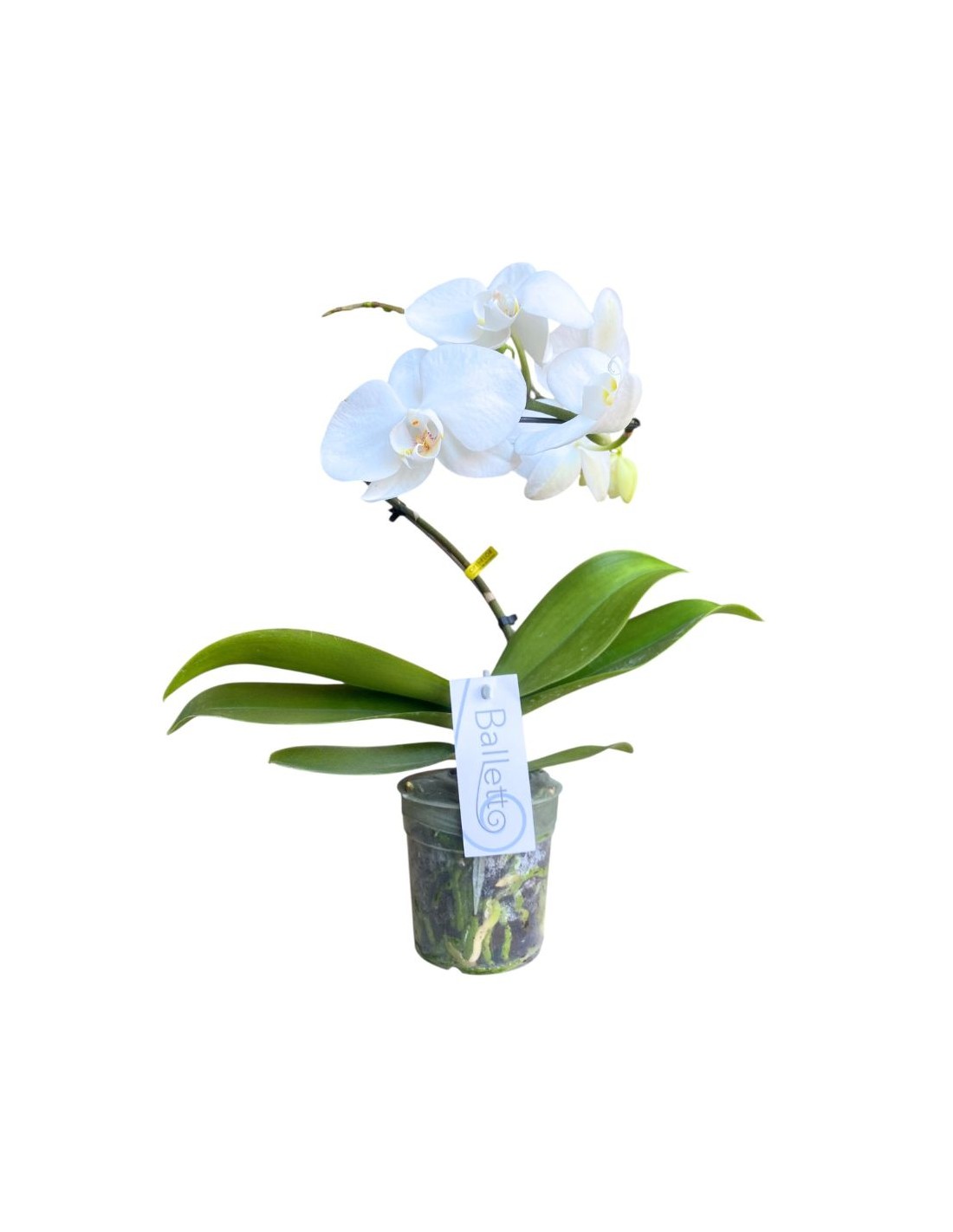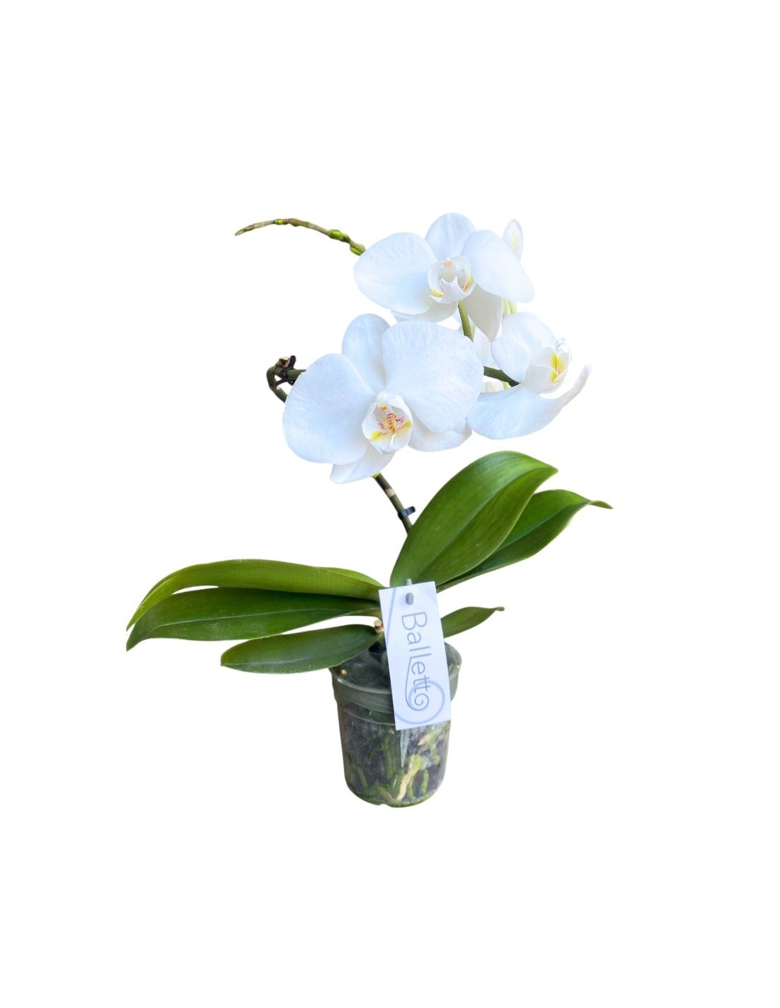 L'Orchidea Phalaenopsis 'Balletto Wing' è l'incarnazione della grazia e della purezza. Questa varietà si distingue per i suoi fiori di un bianco candido e immacolato, che le conferiscono un aspetto raffinato e senza tempo, perfetto per l'arredamento di interni moderni o classici. La sua peculiarità più apprezzata, e che esalta il suo nome, è la sua struttura di coltivazione: lo stelo fiorifero viene sapientemente guidato in una forma ad arco o a cerchio, creando una scultura naturale che dona movimento ed eleganza. Contenuta nel suo vaso da 12 cm, è un magnifico pezzo d'arredo vivente e rappresenta una delle più richieste Piante fiorite da interno per la sua bellezza e la sua fioritura eccezionalmente lunga (fino a 3-6 mesi).