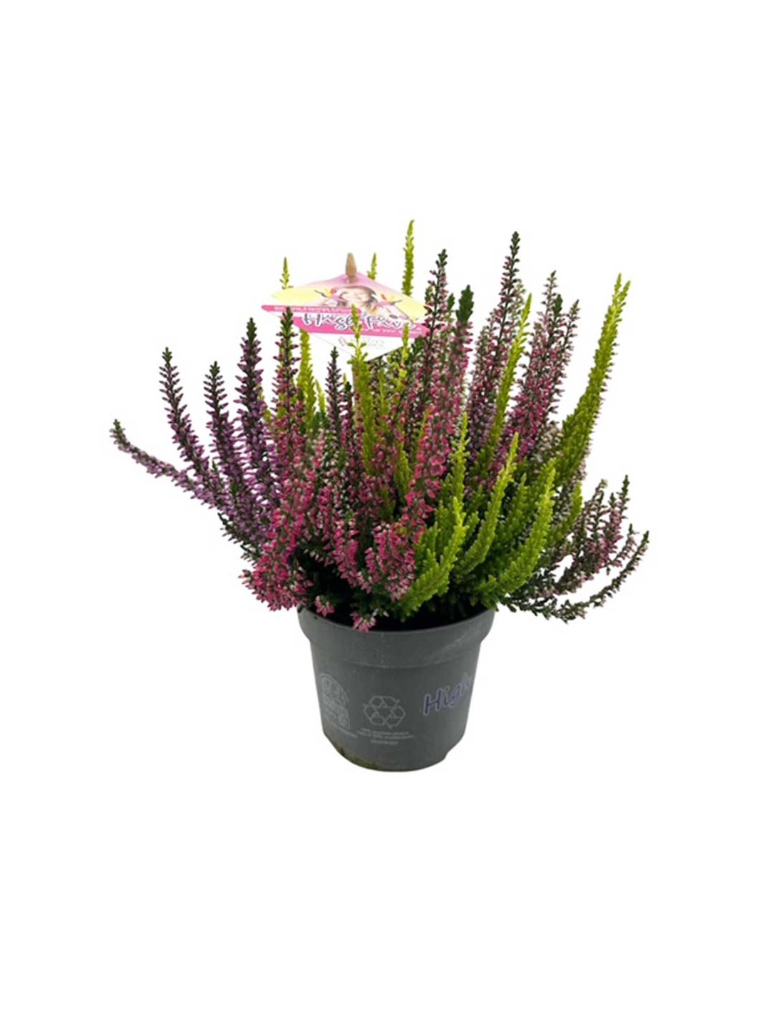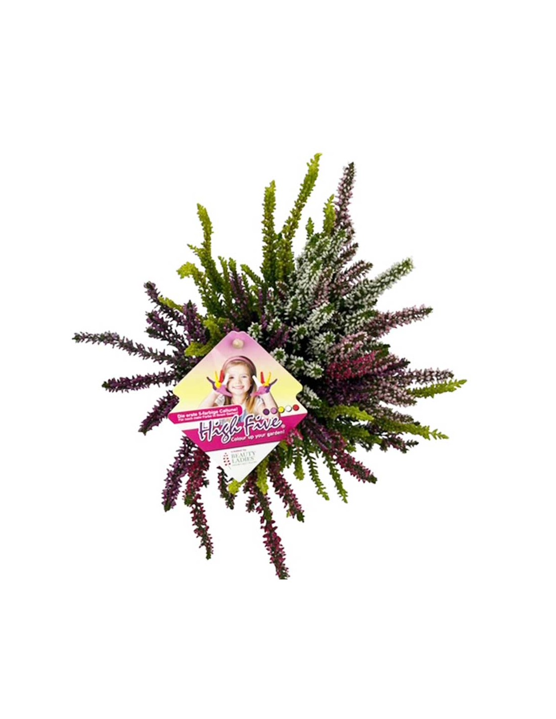 La Calluna vulgaris 'Beauty Lady High Five' è una vera opera d'arte botanica, una varietà unica di erica che racchiude in un unico vaso ben cinque tonalità di colore. Il nome 'High Five' (cinque in alto) è un omaggio a questa sua straordinaria peculiarità, che le permette di offrire una fioritura multicolore, con sfumature di rosa, viola, bianco e diverse tonalità di verde. Questa miscela di colori, sapientemente combinata, crea un effetto visivo dinamico e di grande impatto, rendendo questa pianta una protagonista indiscussa di qualsiasi composizione. Appartiene alla famiglia delle Ericaceae ed è una pianta rustica e compatta, ideale per chi cerca una soluzione decorativa che sia bella e facile da curare.