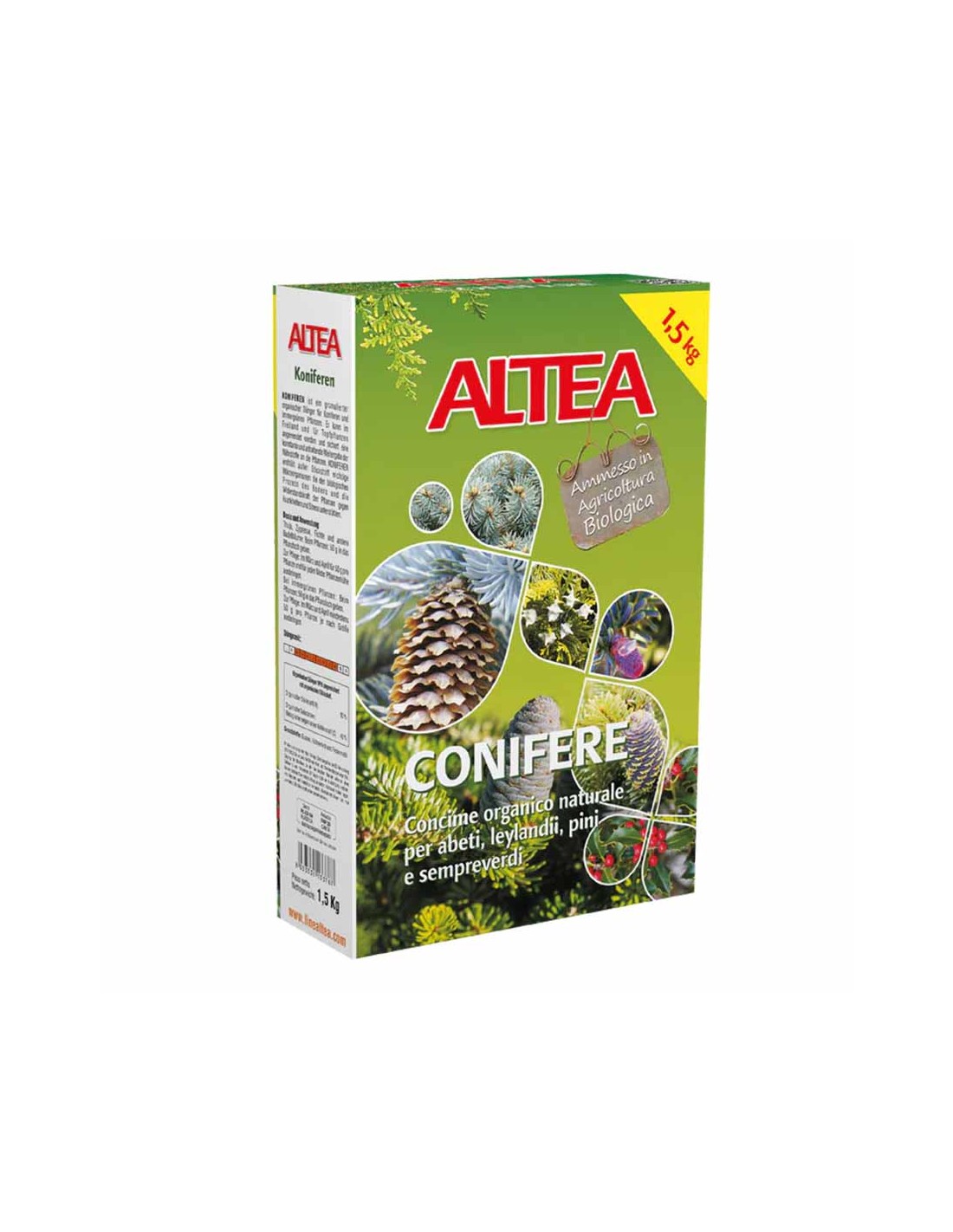 Altea Conifere è un concime completo, studiato per soddisfare le esigenze nutrizionali di un'ampia varietà di conifere come abeti, tassi, larici, ginepri, pini silvestri, cedri, tujie e molti altri. Ma la sua efficacia non si limita a queste specie: è perfetto anche per una vasta gamma di sempreverdi ornamentali come bossi, lauri, pittospori, evonimi, ligustri e agrifogli, sia che siano coltivati in vaso sia che arricchiscano il tuo giardino in piena terra.