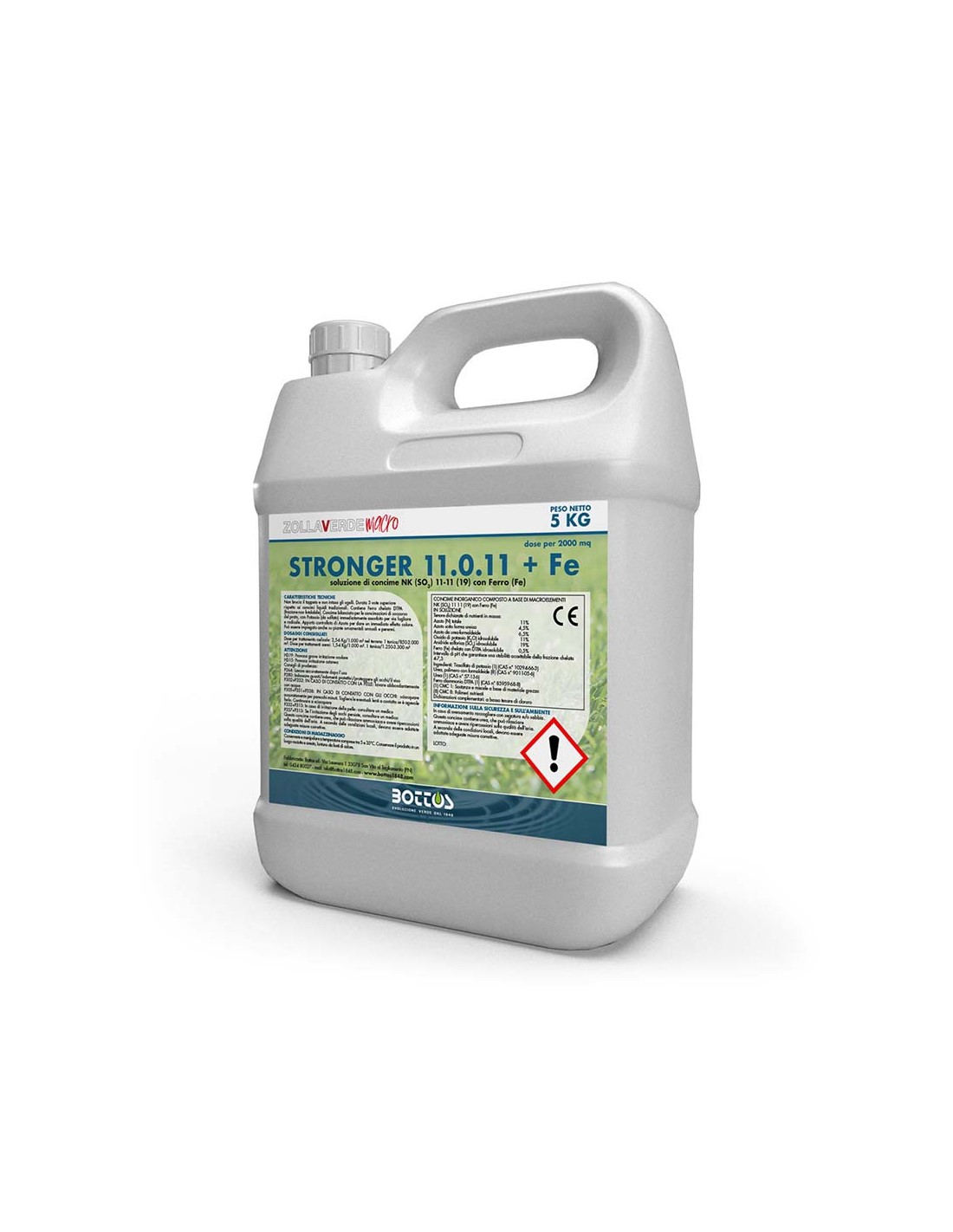 STRONGER, concime liquido NK 11.11 + Fe (chelato DTPA), si differenzia da altri formulati liquidi per la presenza combinata di Azoto a pronto effetto, sotto forma ureica, e di Azoto a lenta cessione, sotto forma di metilenurea. In questo modo, STRONGER assicura una perfetta densità in ogni periodo di attività vegetativa del prato e per lungo tempo. La sua azione di spinta è equilibrata tra la parte aerea, che necessita di aiuto per la fotosintesi, e la parte radicale, che deve ottimizzare l'assorbimento dei sali minerali esplorando il terreno.