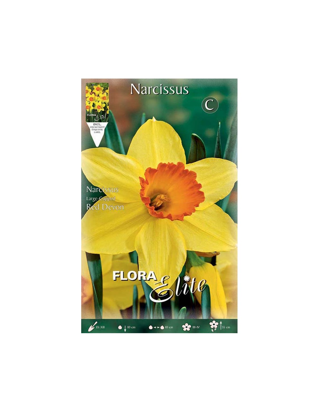 Il narciso 'Red Devon' è una cultivar relativamente recente, selezionata per la sua grande corona e i suoi colori vivaci. I narcisi a grande corona sono stati ottenuti incrociando diverse specie di narciso e sono diventati molto popolari nei giardini moderni per la loro varietà di colori e forme.